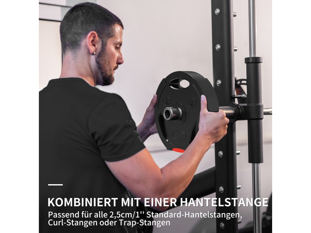 - Standardní uchycení: Vybaveno středovým otvorem o průměru 2,5 cm, který zajišťuje kompatibilitu zátěžových desek se všemi standardními tyčemi na činky pro bezproblémový trénink