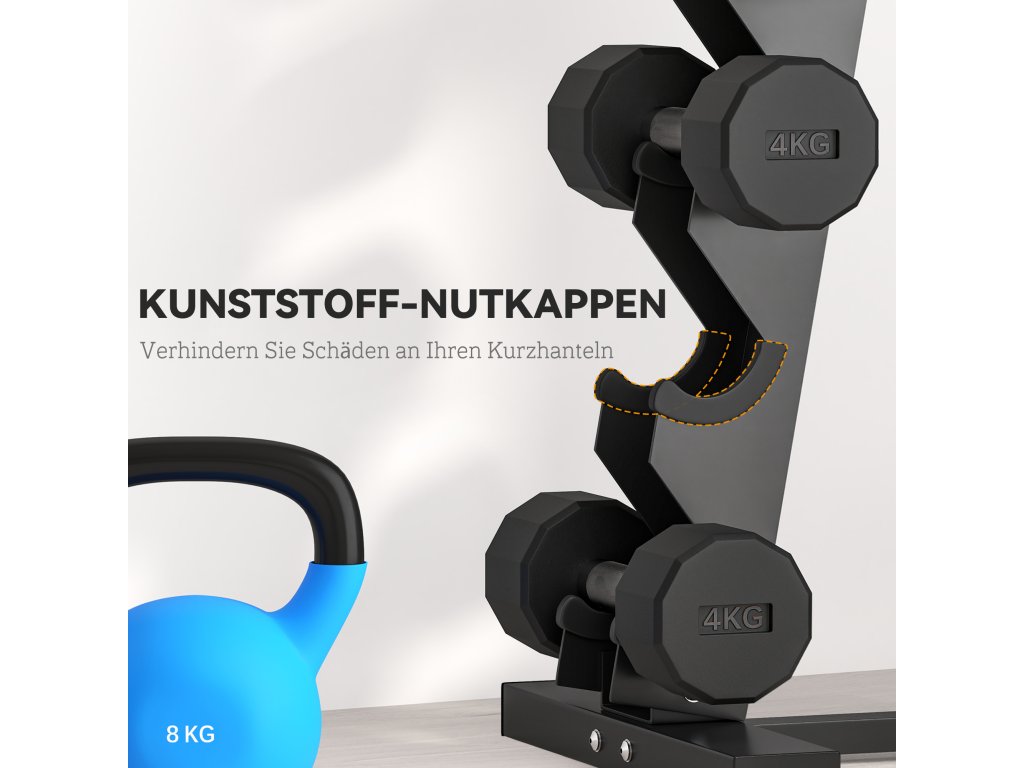 - Důmyslný design: Naše plastové vložky chrání činky před poškozením. Široká základna s protiskluzovými chrániči podlahy zajišťuje, že jednotka zůstane stabilní, když činky odložíte
