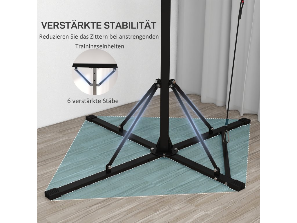- Stabilní konstrukce: Stojan na boxovací pytel je vyztužen šesti vzpěrami, které lépe tlumí nárazy a zajišťují větší stabilitu během intenzivních tréninků