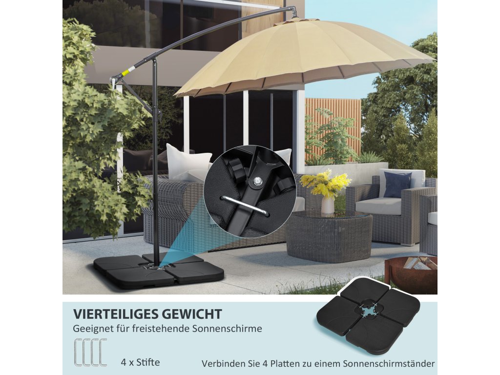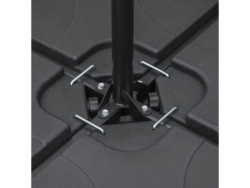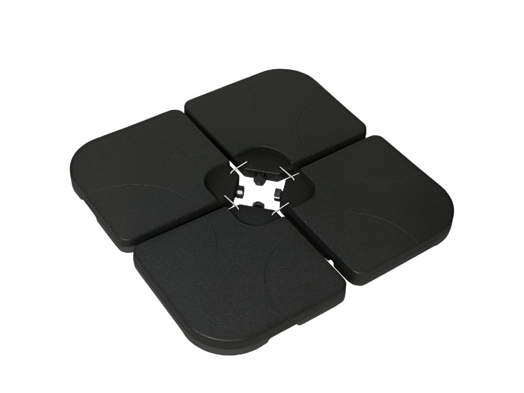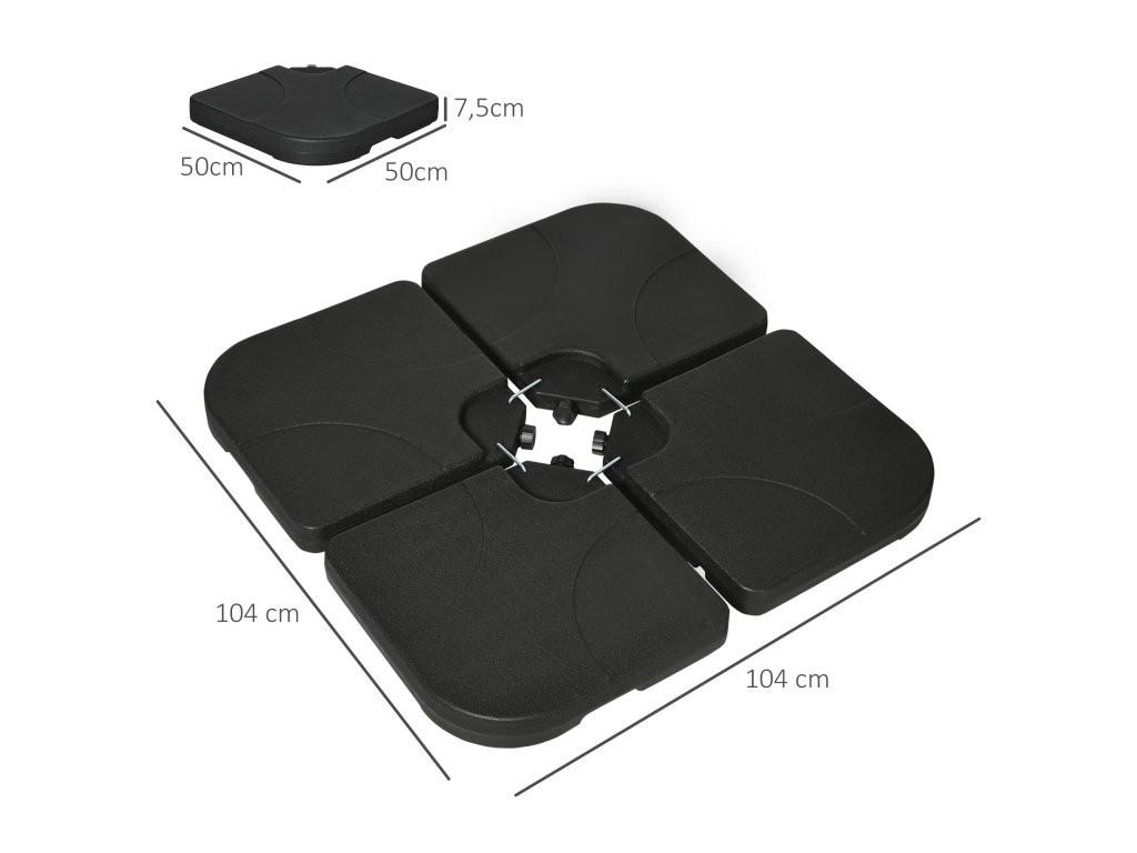- Silný plast: HDPE je robustní a odolný, závaží pro slunečníky jsou vhodná pro venkovní použití. Součástí jsou čtyři kovové spojky, které drží kusy pohromadě.