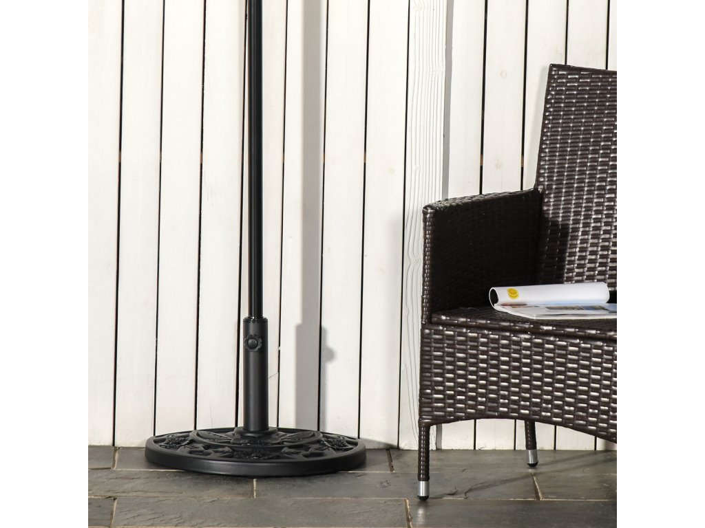Tento poloviční stojan na slunečník od společnosti Outsunny dodá vašemu zahradnímu nábytku elegantní vzhled. Je vyroben ze směsi HDPE, cementu a kovu a váží 9 kg, takže odolá silnému dešti i větru a je vhodný pro celoroční použití. Stojan v univerzální černé barvě má horní část s vyrytým jemným a krásným květinovým vzorem a je vybaven zajišťovacím šroubem pro zajištění tyče slunečníku na místě.