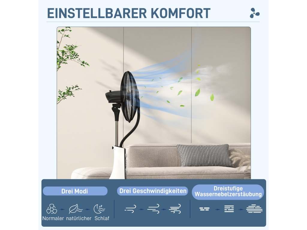 Zažijte osvěžující vánek s podstavným ventilátorem HOMCOM 2 v 1. Tento inovativní podstavný ventilátor nabízí chladivý vánek i funkci zvlhčování vzduchu, které lze používat společně nebo samostatně a vytvořit tak v místnosti zdravou a příjemnou atmosféru. Vyberte si ze tří rychlostí a režimů - Normální, Přirozený nebo Spánek, abyste mohli vždy volně a zhluboka dýchat.