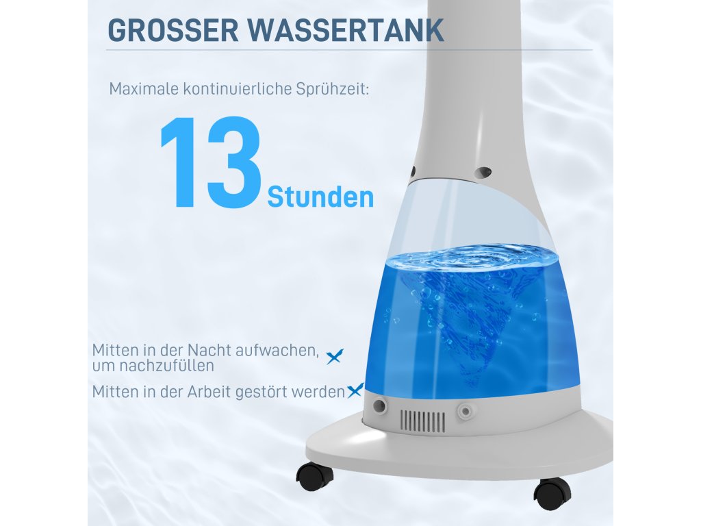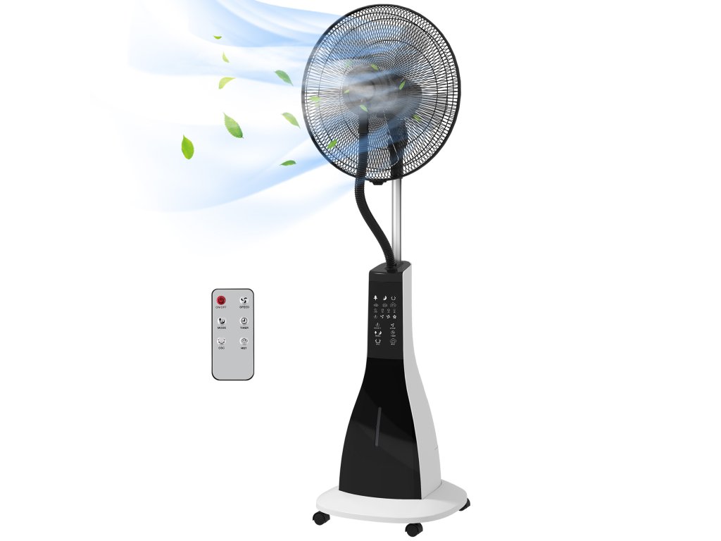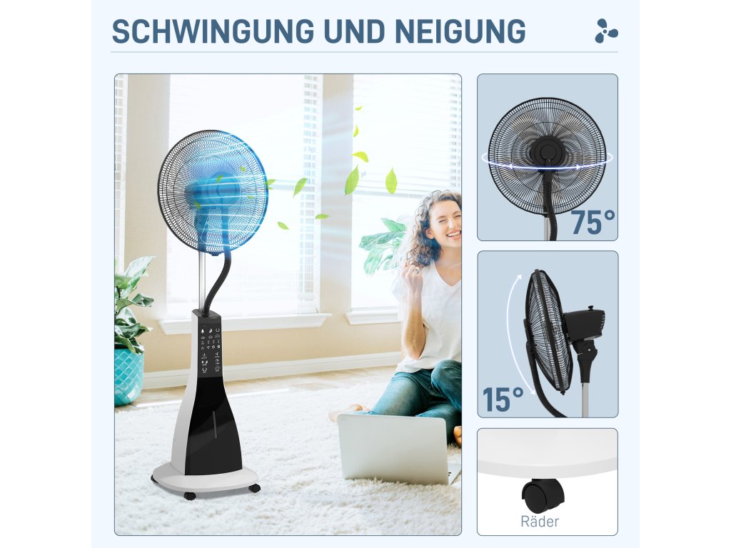 - Flexibilní polohování: nasměrujte proudění vzduchu a zvlhčování přesně tam, kde potřebujete pro optimální pohodlí, a to díky rozsahu otáčení 75° a náklonu 15°. Díky kolečkům se podstavný ventilátor s funkcí mlhy snadno přemisťuje