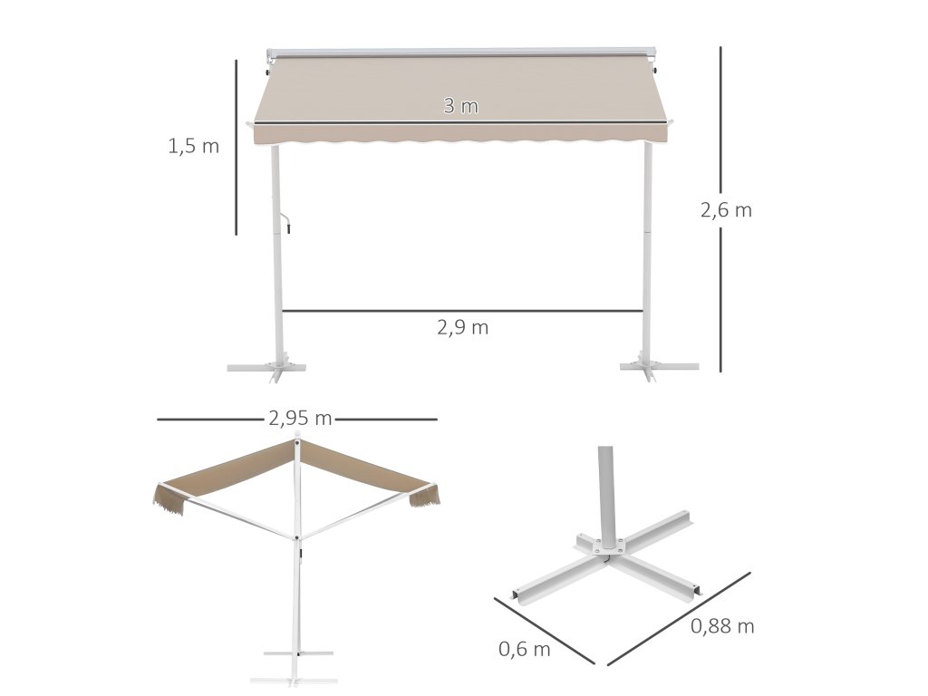 - Rozměry: 300L x 295W x 255H cm, délka kliky 150 cm, rozměry základny 90L x 90W cm, Ø nosné tyče 54 mm