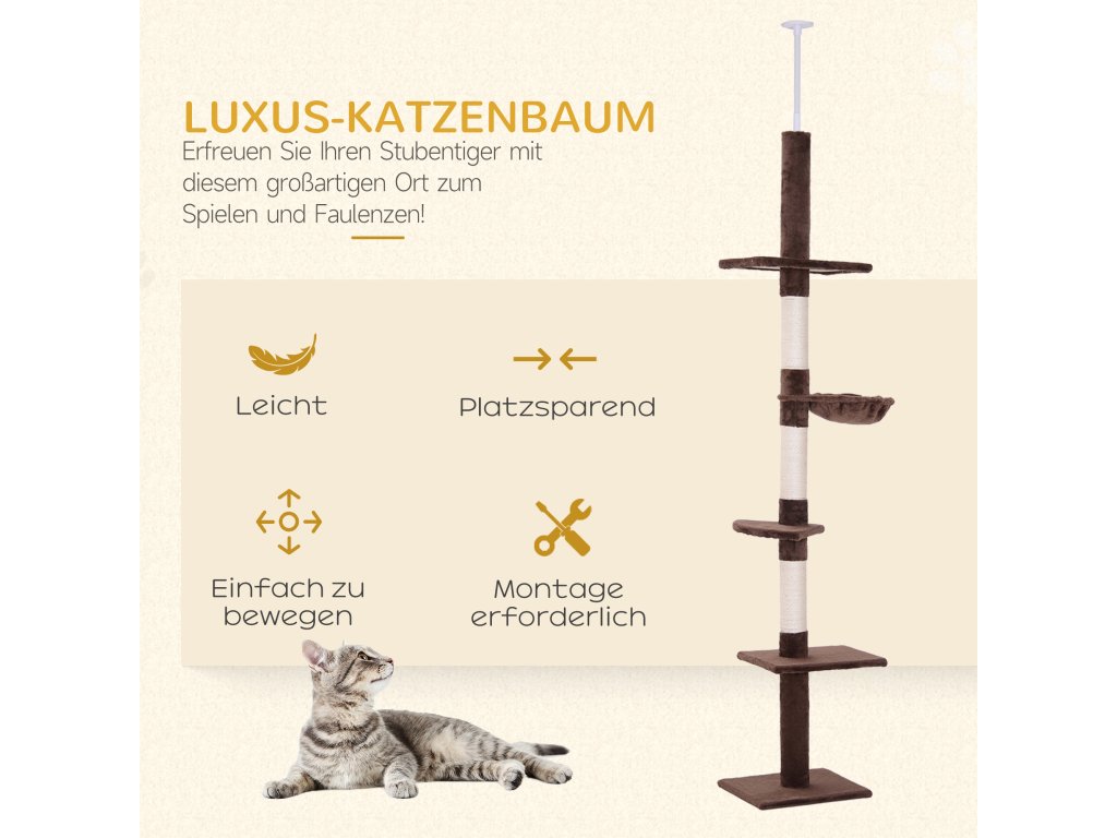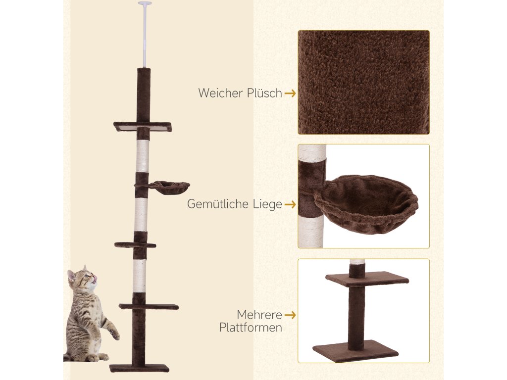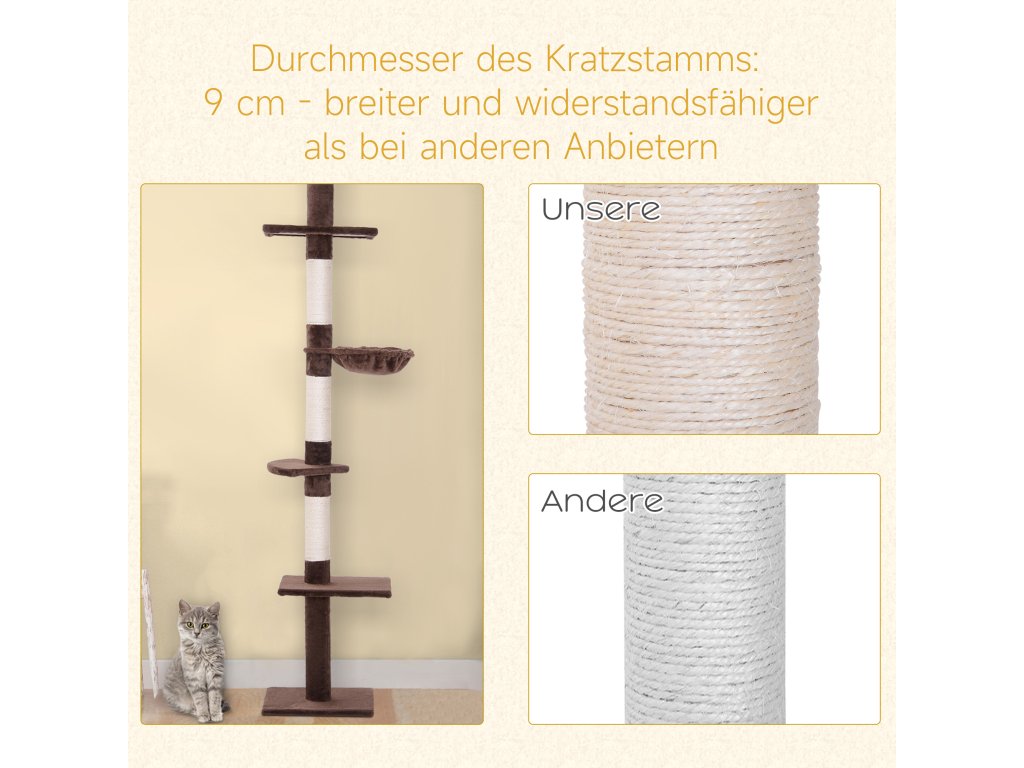 Stropní škrabadlo PawHut vysoké 230-260 cm - výškově nastavitelný kočičí strom s robustními sisalovými sloupky v hnědé barvě pro milovníky koček | Aosom.de