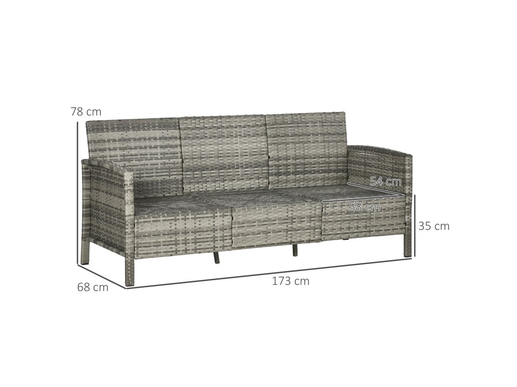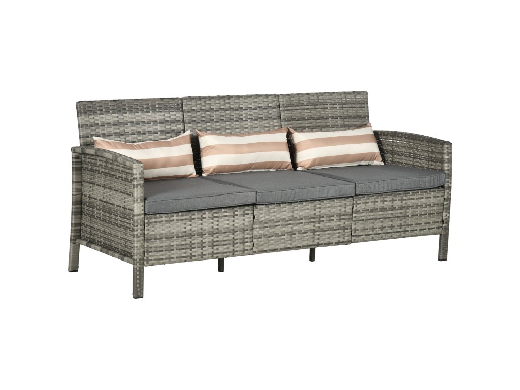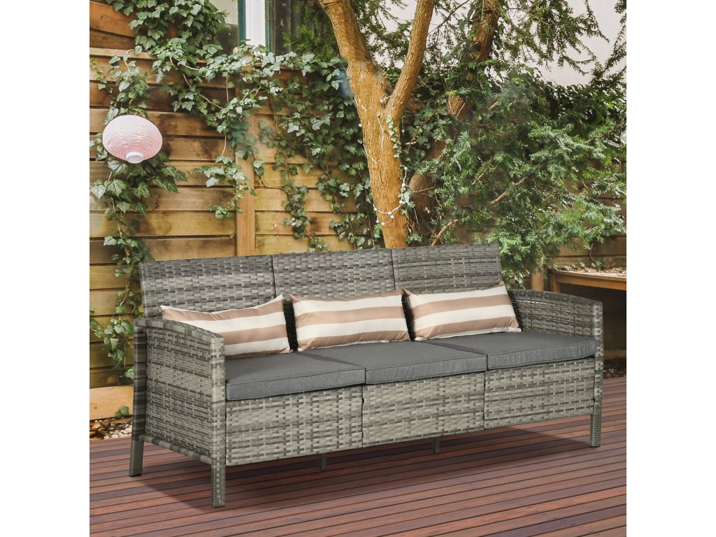 Třímístná zahradní ratanová pohovka Outsunny s polštáři, ocelový rám, šedá barva, 173 x 68 x 78 cm, ideální na terasu a balkon |
