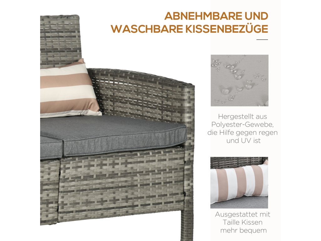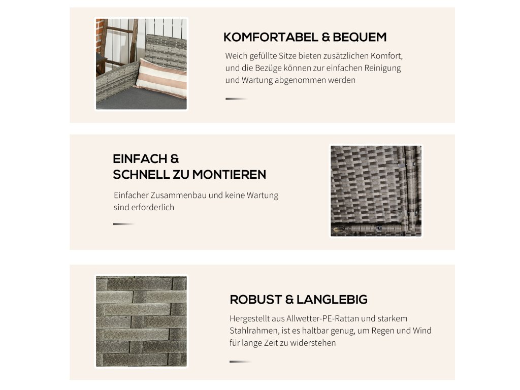 Trendy nábytek na terasu: s touto zahradní pohovkou pro tři osoby od společnosti Outsunny si můžete vytvořit útulné venkovní posezení. Pohovka zaujme svým kvalitním ratanovým vzhledem a skvěle se hodí k našim zahradním křeslům Outsunny. Materiál je robustní a odolný vůči povětrnostním vlivům. Zahradní pohovka se dodává se třemi sedáky a třemi opěrnými polštáři. Dopřejte sobě i svým hostům pohodlí - u bazénu, na terase nebo v zimní zahradě.