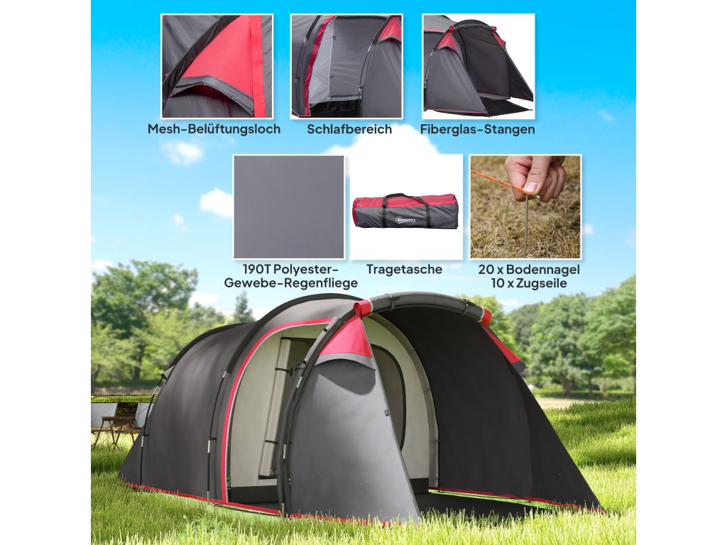 Tunelový stan Outsunny pro 2-3 osoby, kempinkový stan 190T s kolíky, sklolaminát a polyester, šedý, 426 x 206 x 154 cm, ideální pro venkovní dobrodružství | Aosom.de