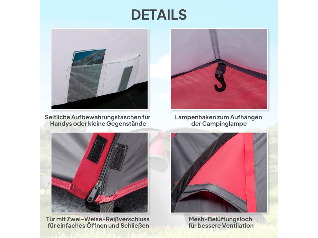 - Vysoce kvalitní materiál: Dešťovka z nepromokavého polyesteru 190T a silné pružné tyče ze skelných vláken zaručují stabilitu. Kolíky do země a lana udržují stan stabilizovaný ve větru