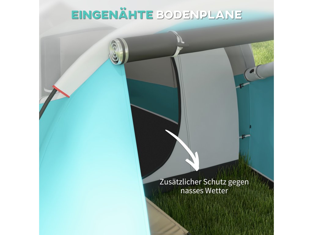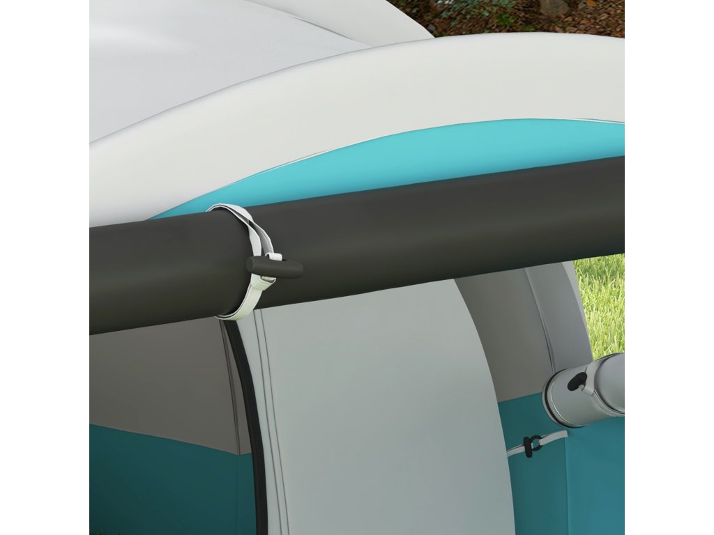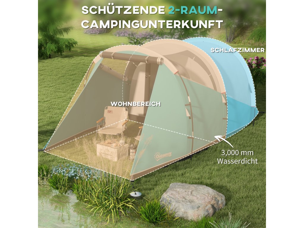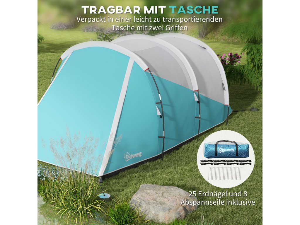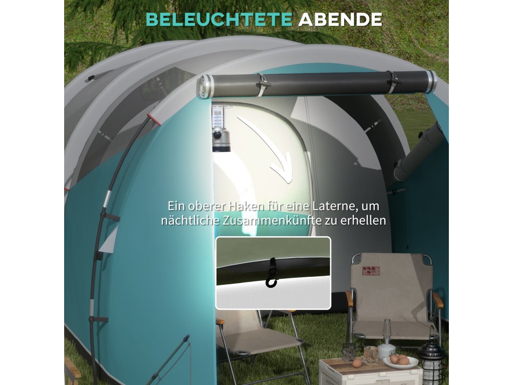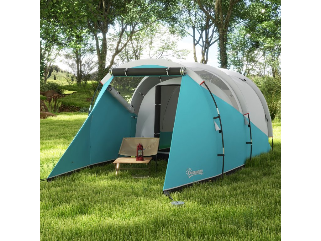Poznejte přírodu zblízka s tímto útulným kempinkovým stanem Outsunny! Tento prostorný rodinný stan nabízí místo pro čtyři až pět osob a umně odděluje obytnou a spací část. Tunelový stan má vysokou přední část a útulnou nízkou část na spaní, které jsou zakryty nepromokavou (3 000 mm vodního sloupce) plachtou, abyste zůstali v suchu. Praktický háček na lucernu zajistí atmosférické večery pod hvězdami.