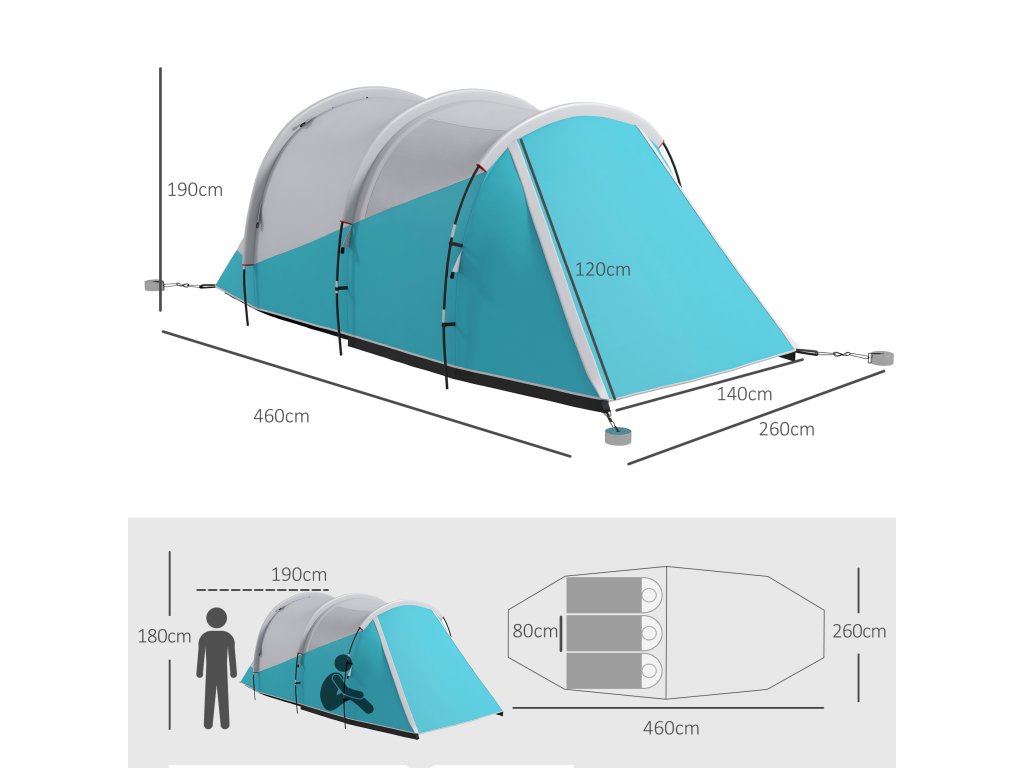 - ✔ Tunelový stan s vysokým vchodem a nízkým prostorem na spaní odděluje obytný prostor od prostoru na spaní a nabízí prostor pro 4-5 osob