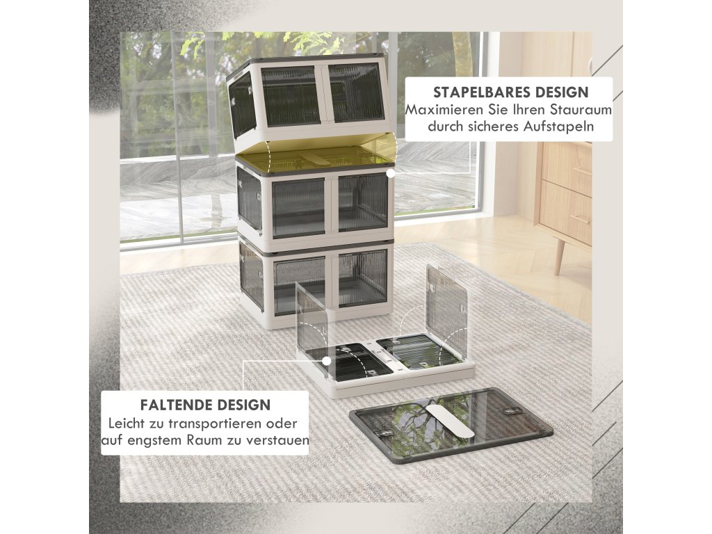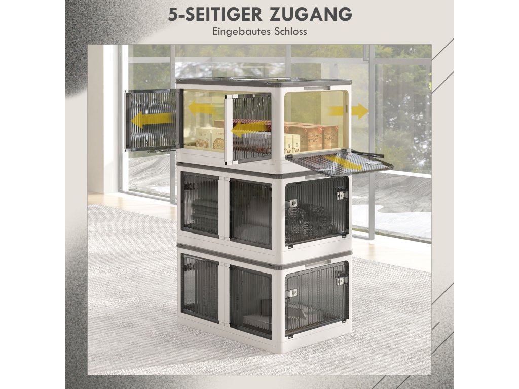 - Přístup bez námahy z jakéhokoli úhlu: Díky přístupu z pěti stran tento skládací úložný box usnadňuje hledání a ukládání předmětů v každé situaci a na jakémkoli místě. Už žádné složité hledání těžko přístupných předmětů!