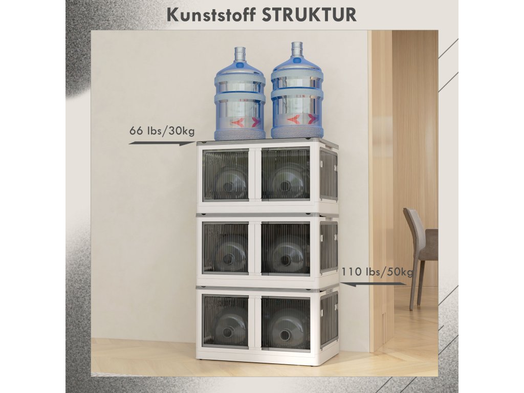 - Bezpečné stohování: Žebrovaná horní část skládacích úložných boxů umožňuje bezproblémové stohování více jednotek, což zajišťuje stabilitu a zabraňuje převrácení předmětů. Maximalizujte svůj úložný prostor díky bezpečnému stohování.