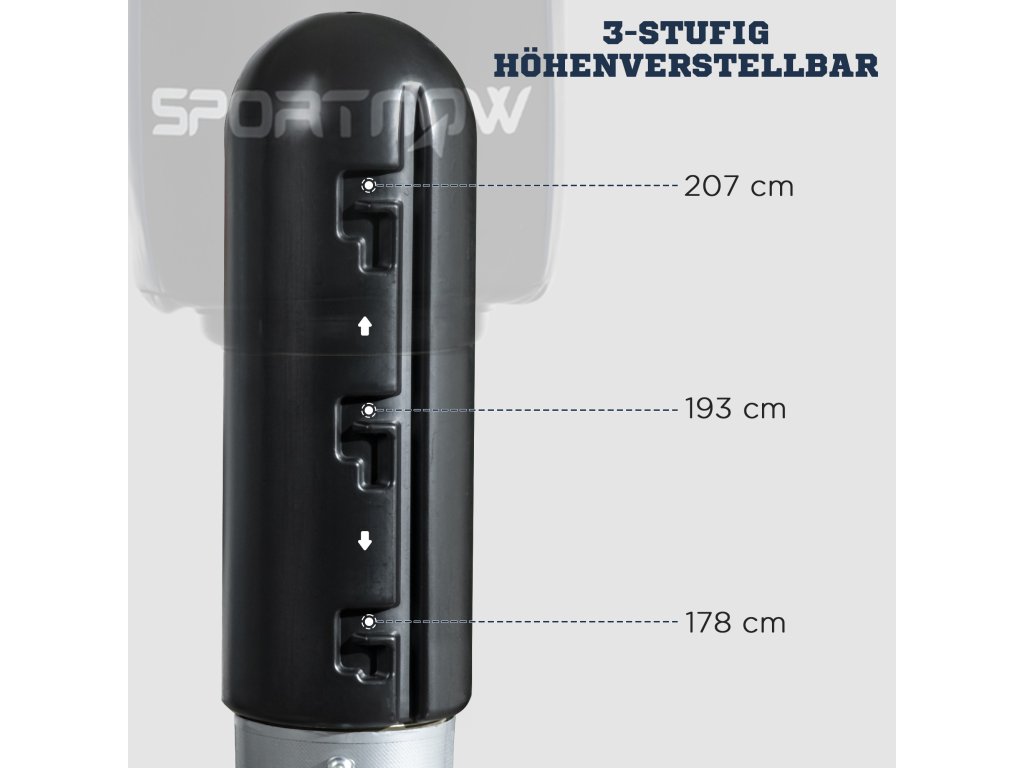 - Nastavitelná výška: Výšku lze nastavit v rozmezí 178 až 207 cm, takže mladí lidé i dospělí všech úrovní boxu rychle najdou správnou výšku.