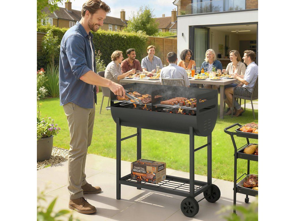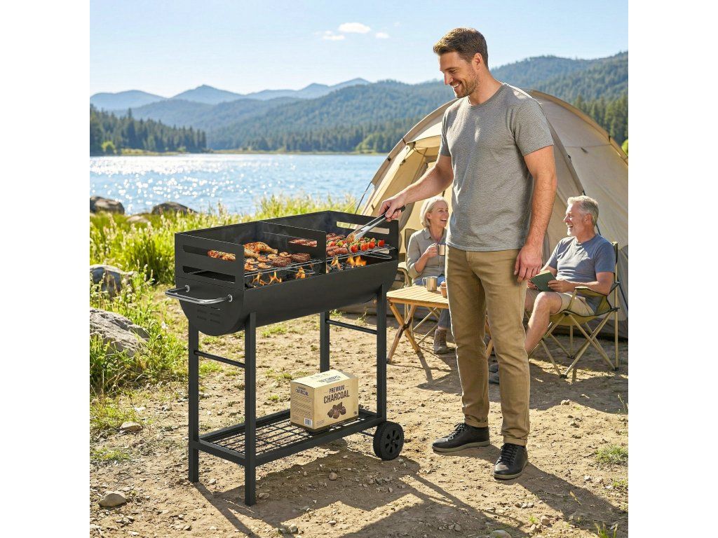 - Dvouzónové grilování: Tento gril na dřevěné uhlí nabízí dvě oddělené grilovací zóny, které vám umožní připravovat různé pokrmy najednou. Vychutnejte si dokonale propečené steaky na jedné straně a lahodně opečenou zeleninu na straně druhé - ideální pro rodinné oslavy a útulné grilování.