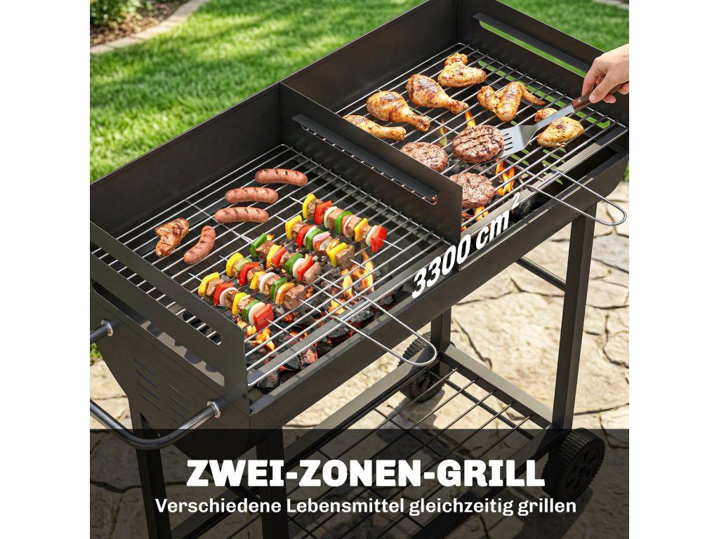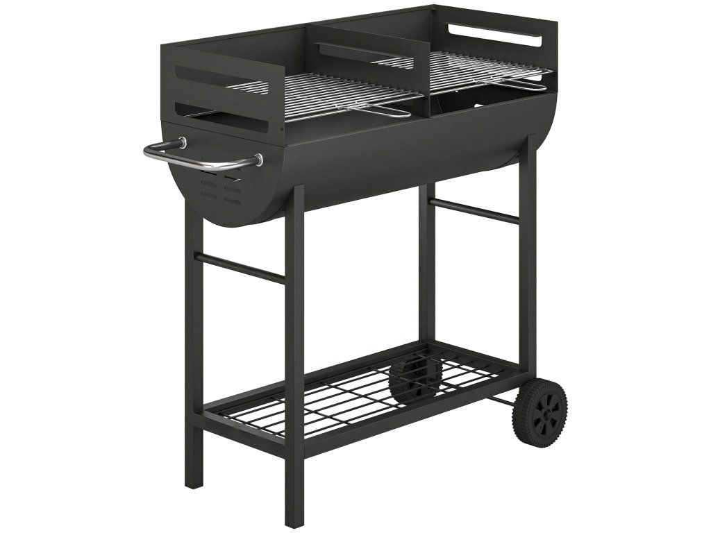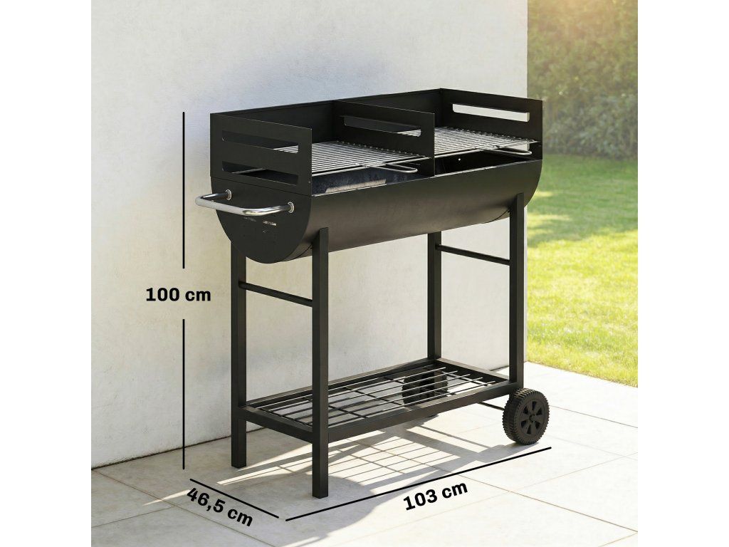 Vozík na grilování dřevěného uhlí se 2 grilovacími zónami výškově nastavitelný grilovací rošt kolečka na dřevo boční rukojeť, 103 x 46,5 x 100 cm