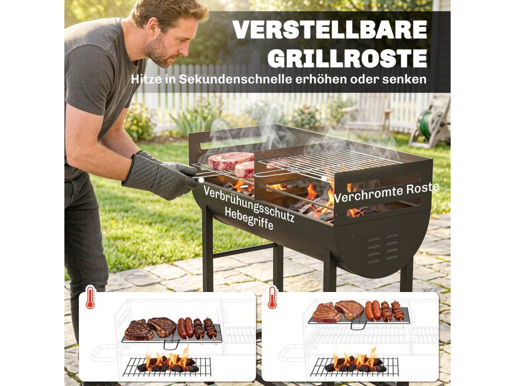 - Výškově nastavitelné grilovací rošty: Chromované grilovací rošty lze bez námahy zvednout nebo snížit a optimálně tak upravit vzdálenost od dřevěného uhlí. Praktické zvedací rukojeti umožňují bezpečně regulovat žár a zabránit připálení pokrmů.