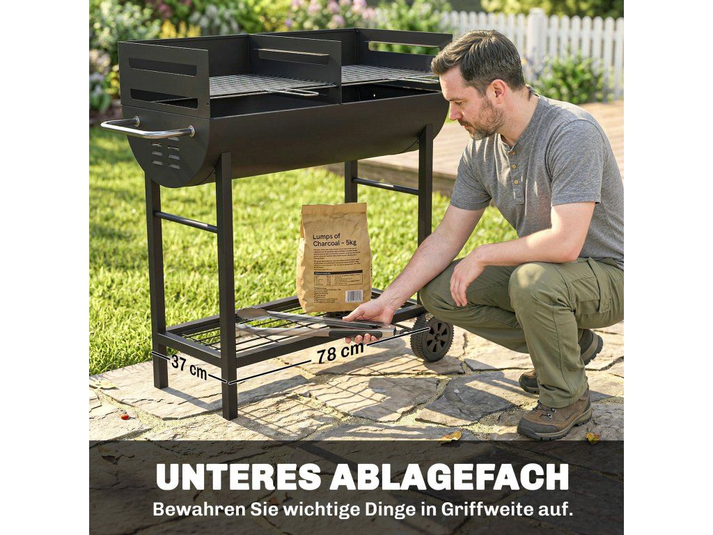 - Spodní odkládací police: Robustní spodní police grilovacího vozíku má nosnost až 15 kg a je ideální pro uložení dřevěného uhlí, grilovacího náčiní, omáček nebo talířů. Díky tomu budete mít vždy vše po ruce a můžete se plně soustředit na grilování.