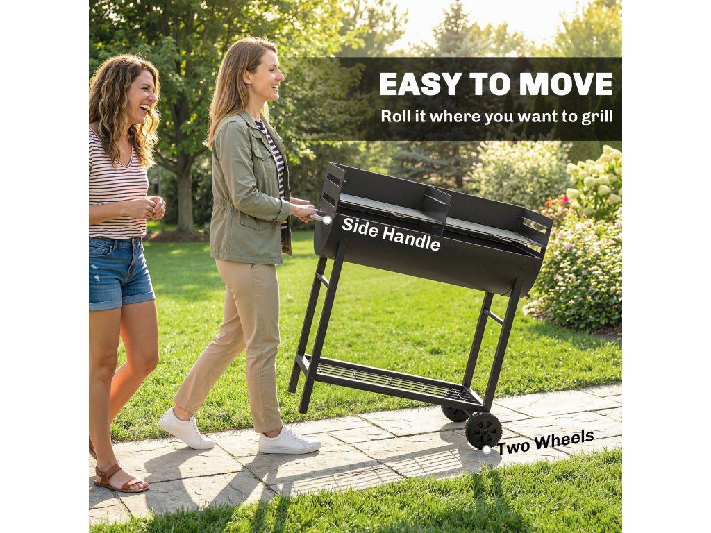 - Přenosné provedení s kolečky: Díky praktickému bočnímu madlu a dvěma kolečkům lze grilovací vozík bez námahy přemisťovat mezi zahradou a terasou. Ať už se jedná o grilovací párty nebo venkovní vaření, můžete jej umístit, kamkoli potřebujete.