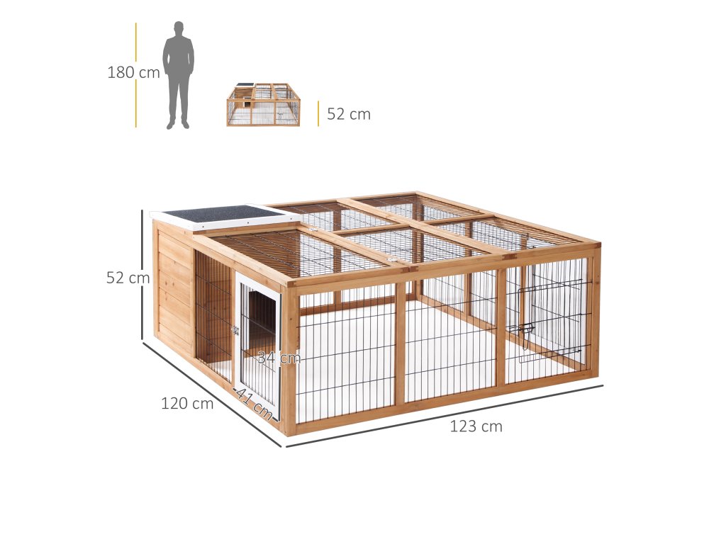 Výběh pro malá zvířata PawHut, 123 x 120 x 52 cm, s vodotěsnou střechou, odnímatelné víko, králíkárna, jedlové dřevo, přírodní | Aosom