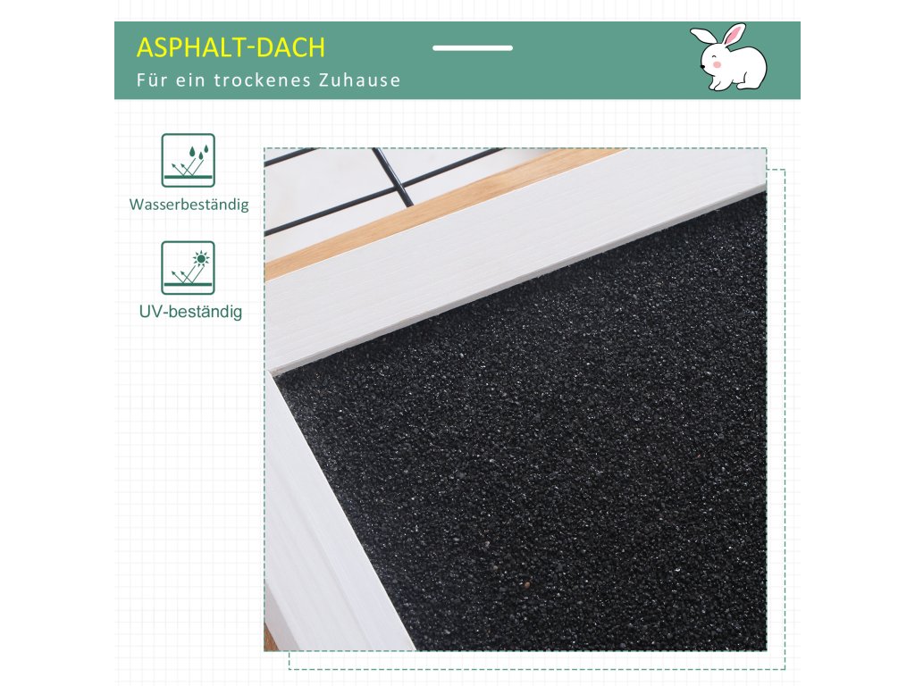- Odolnost vůči povětrnostním vlivům: Rám boudy je vyroben z odolného dřeva odolného vůči povětrnostním vlivům a bouda má voděodolnou asfaltovou střechu, která chrání králíka za každého počasí.