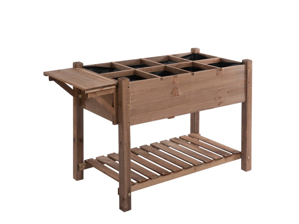 Vyvýšený záhonový truhlík Outsunny 123x54x74cm s 8 rošty a skládací policí z masivního dřeva v hnědé barvě pro zahradu a terasu | Aosom.de