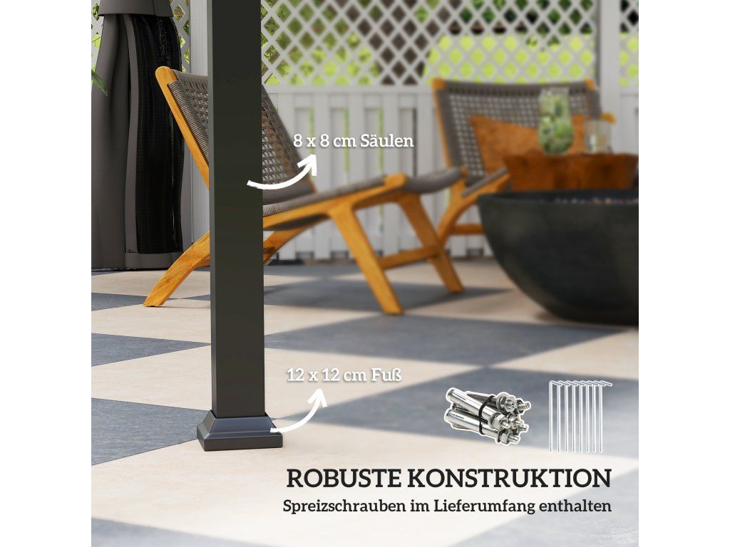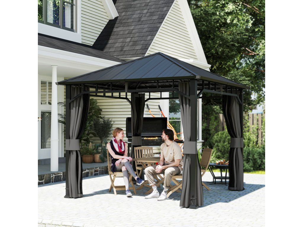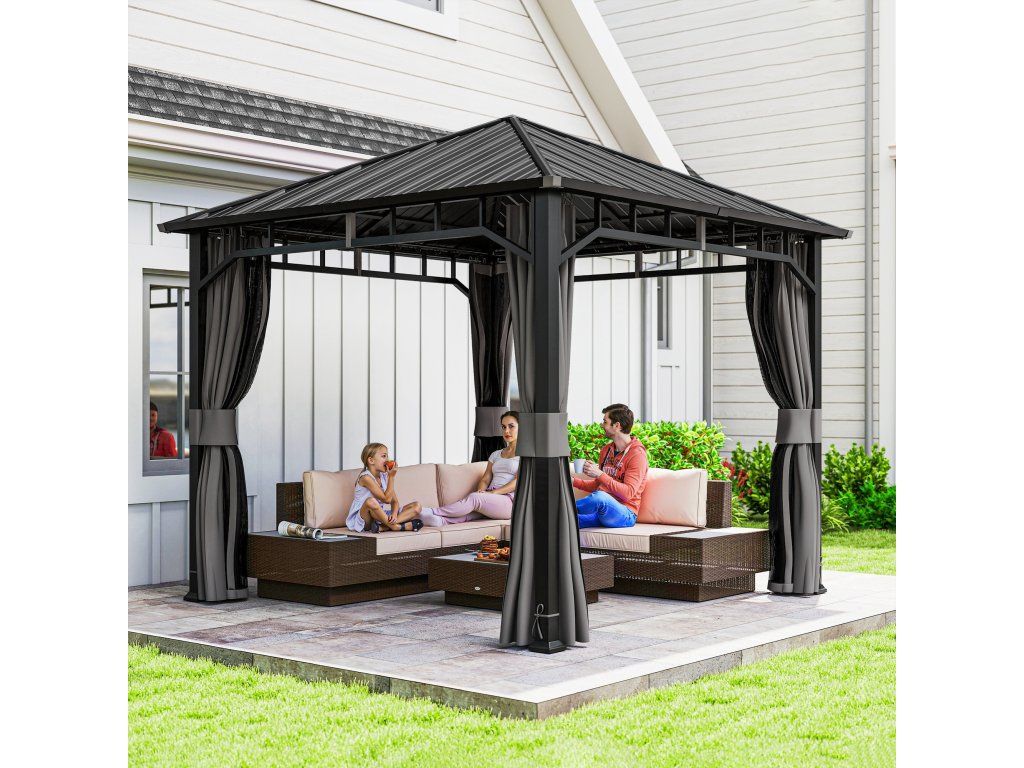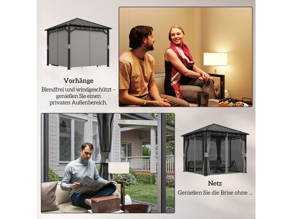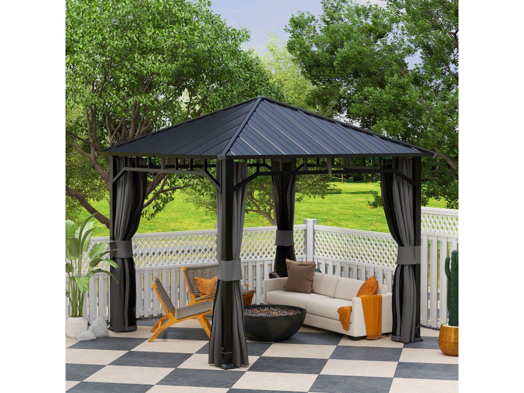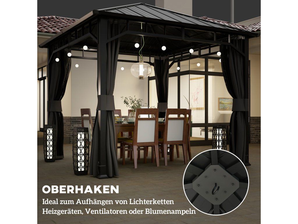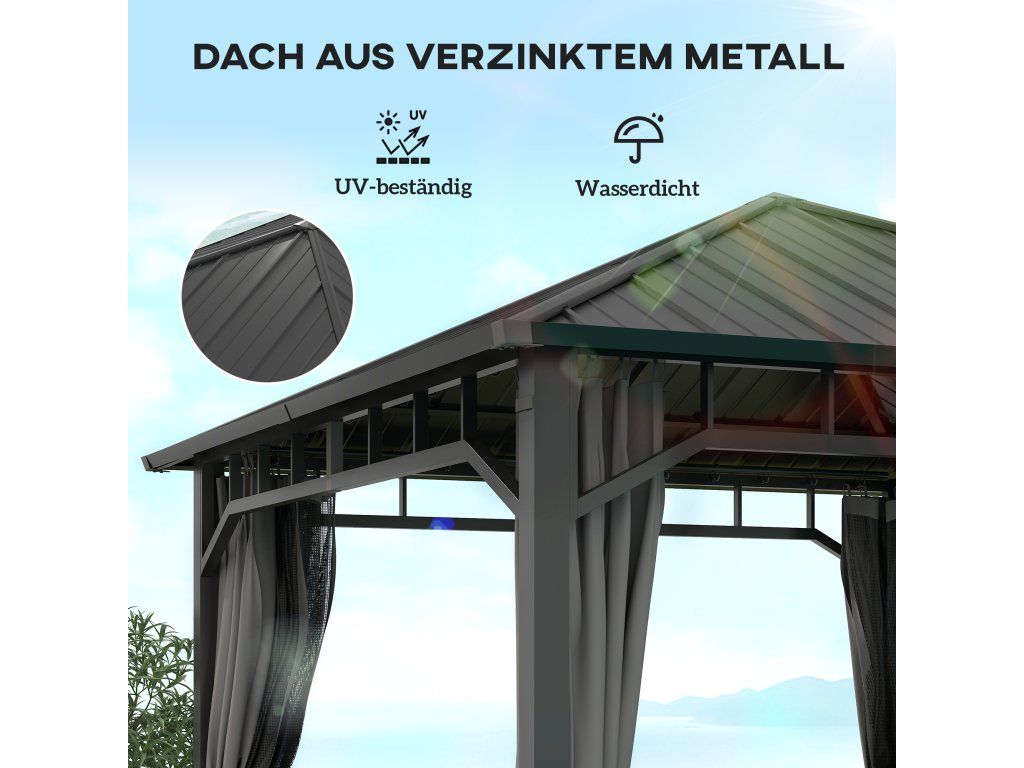Vytvořte si komfortní venkovní prostor s tímto robustním zahradním altánem s pevnou střechou. Pozinkovaná kovová střecha účinně chrání před UV zářením, deštěm i sněhem a zajišťuje celoroční využití.Stabilní kovová konstrukce poskytuje vysokou pevnost a odolnost i při nepříznivém počasí. Altán je vybaven závěsy pro soukromí a moskytiérou, která chrání před hmyzem a zároveň umožňuje cirkulaci vzduchu.
