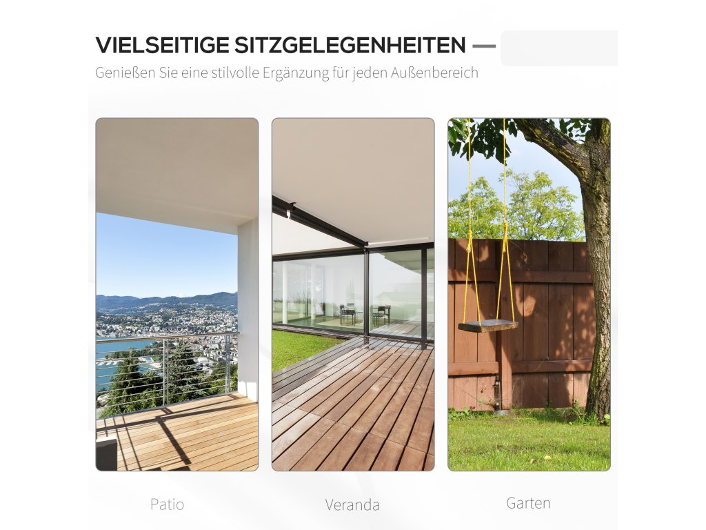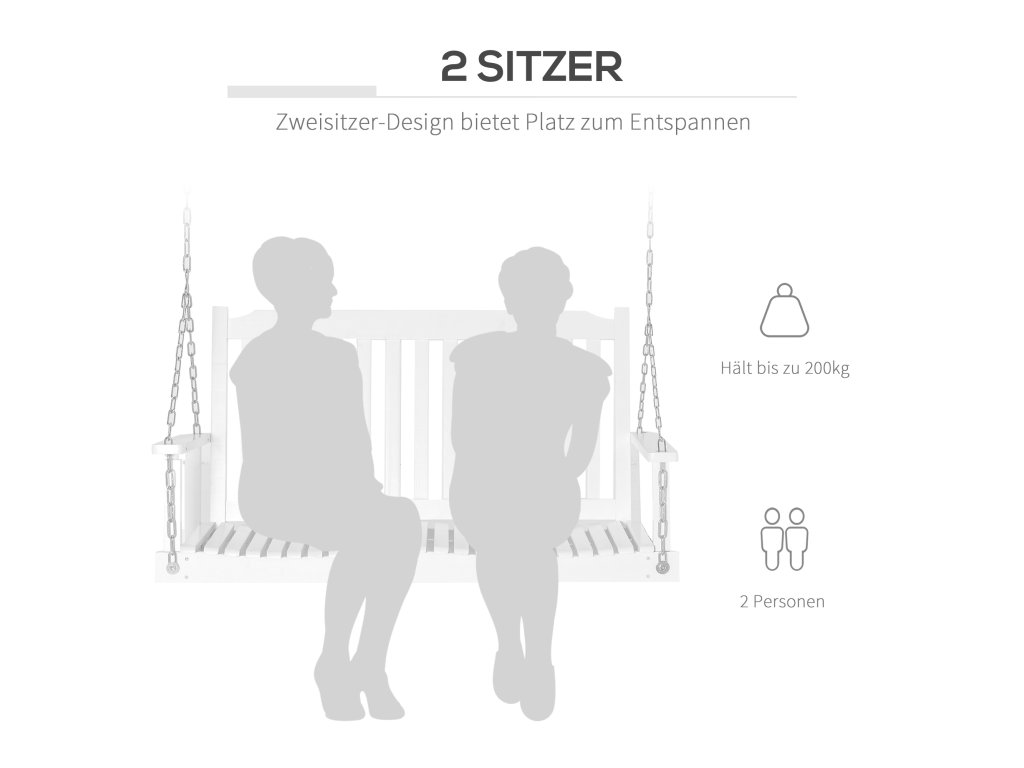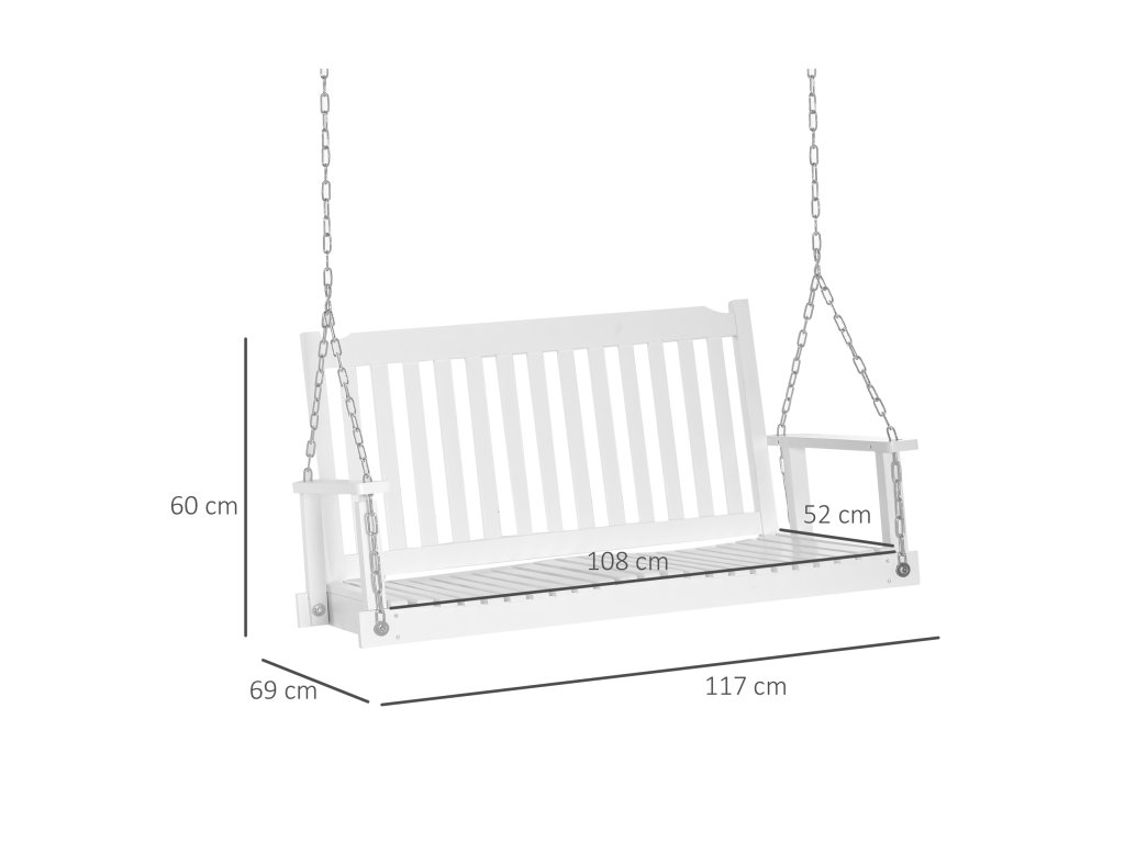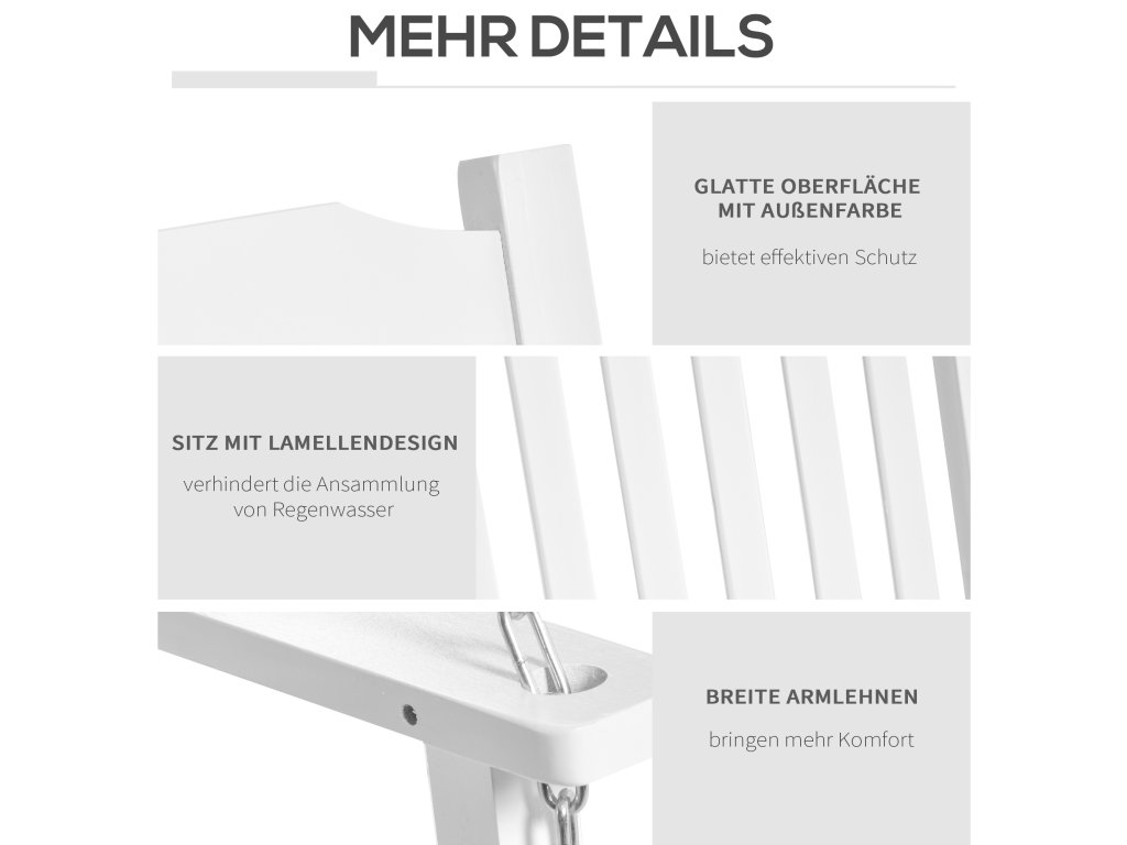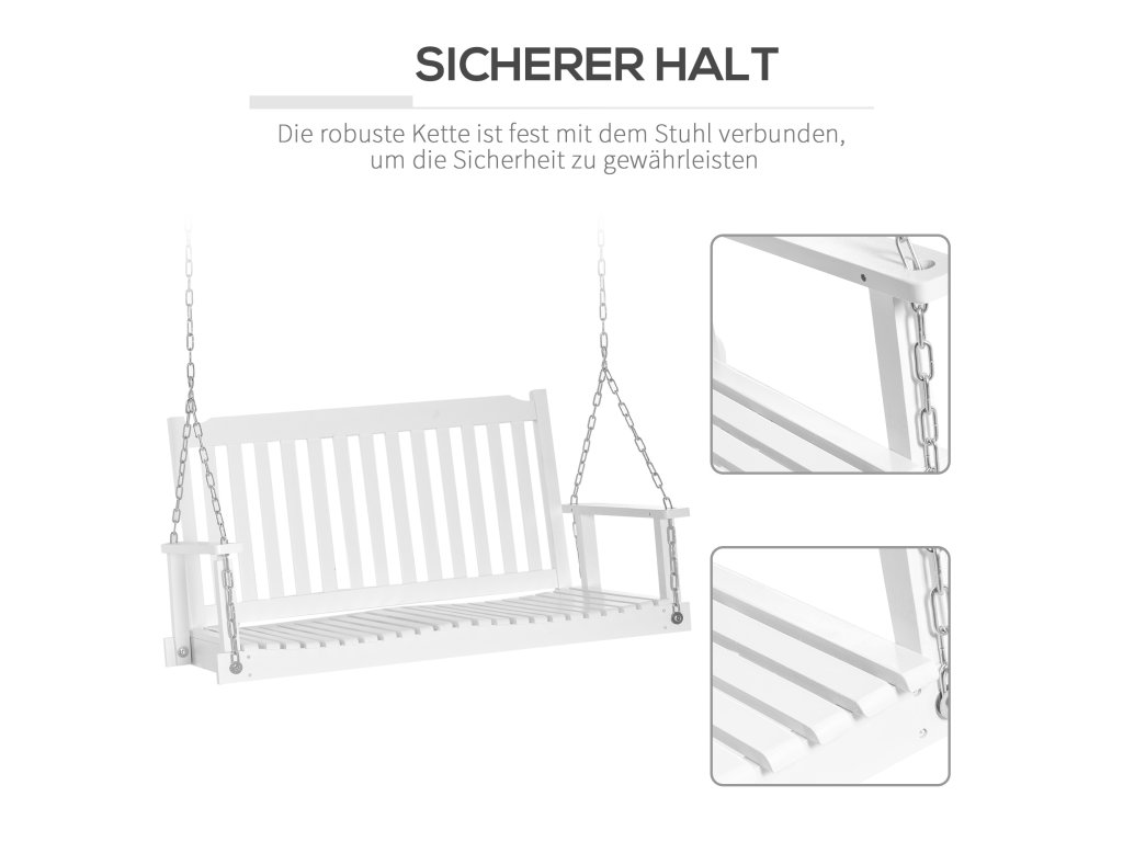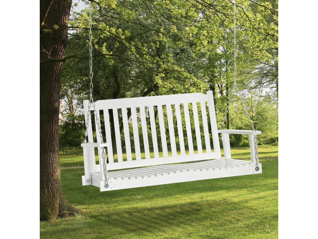 Tato zahradní houpačka od společnosti Outsunny je ideální pro balkony, zahrady a verandy. Bílé dřevěné lamely dodávají houpačce klasický design. Velkorysá sedací plocha nabízí místo pro dvě osoby. Pevné kovové řetězy zajišťují bezpečné uchycení. Vysoké opěradlo a široké područky poskytují dodatečné pohodlí. Zahradní houpačka je odolná vůči povětrnostním vlivům a vodě, což zaručuje dlouhou životnost.