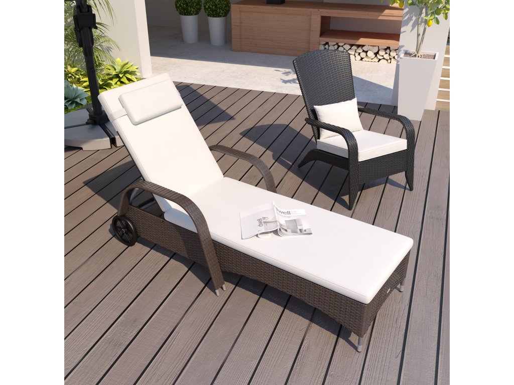 - ✔ Vysoce kvalitní mobilní zahradní lehátko z polyratanu odolného proti povětrnostním vlivům v moderním designu