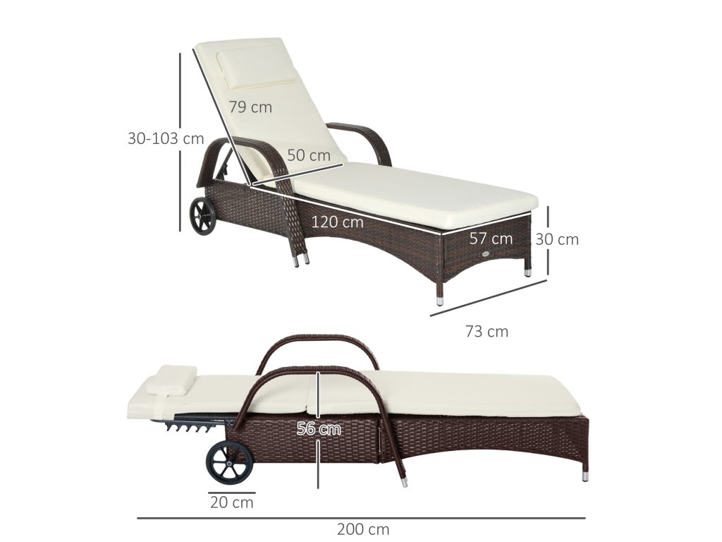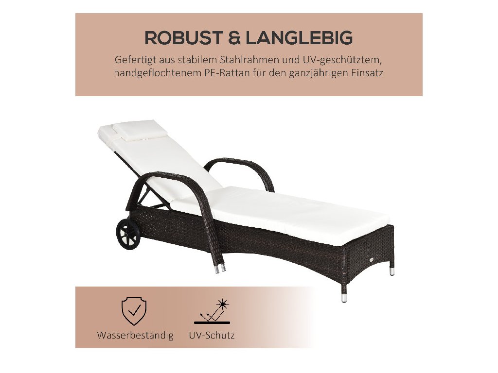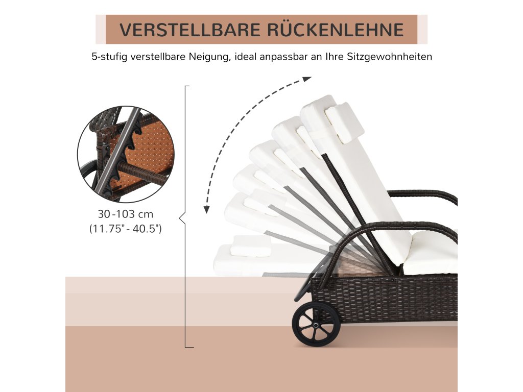Zahradní lehátko Outsunny s polštáři a kolečky, mobilní ratanové lehátko z polyratanu a kovu, kávově hnědé, 200 x 73 x 30-103cm | Aosom.de