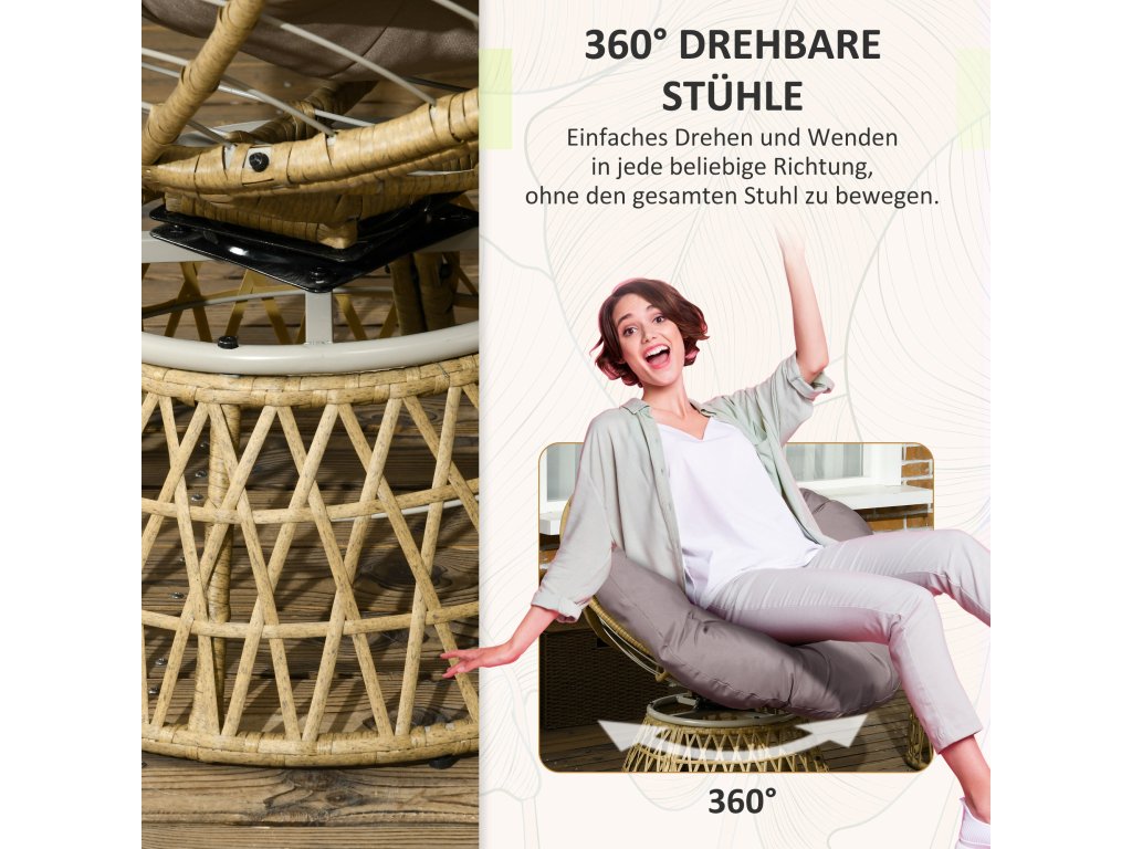 - ✔ Židle otočné o 360° umocňují zážitek z posezení při konverzaci, pozorování slunce a pohodlí