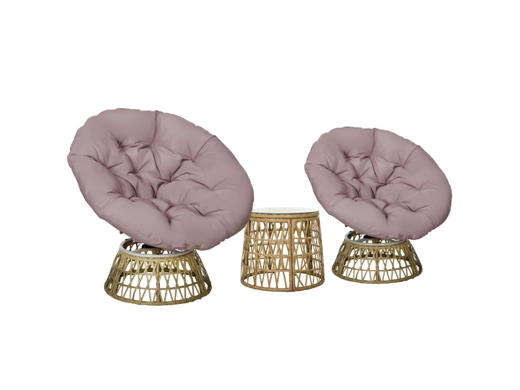 - třídílná ratanová souprava: Ideální pro páry nebo malé rodiny, skládá se ze dvou ratanových volnočasových křesel a skleněného stolu s deskou z tvrzeného skla. Ať už máte malou terasu, balkon, přední verandu, prostor u bazénu nebo zahradu, je to ideální volba