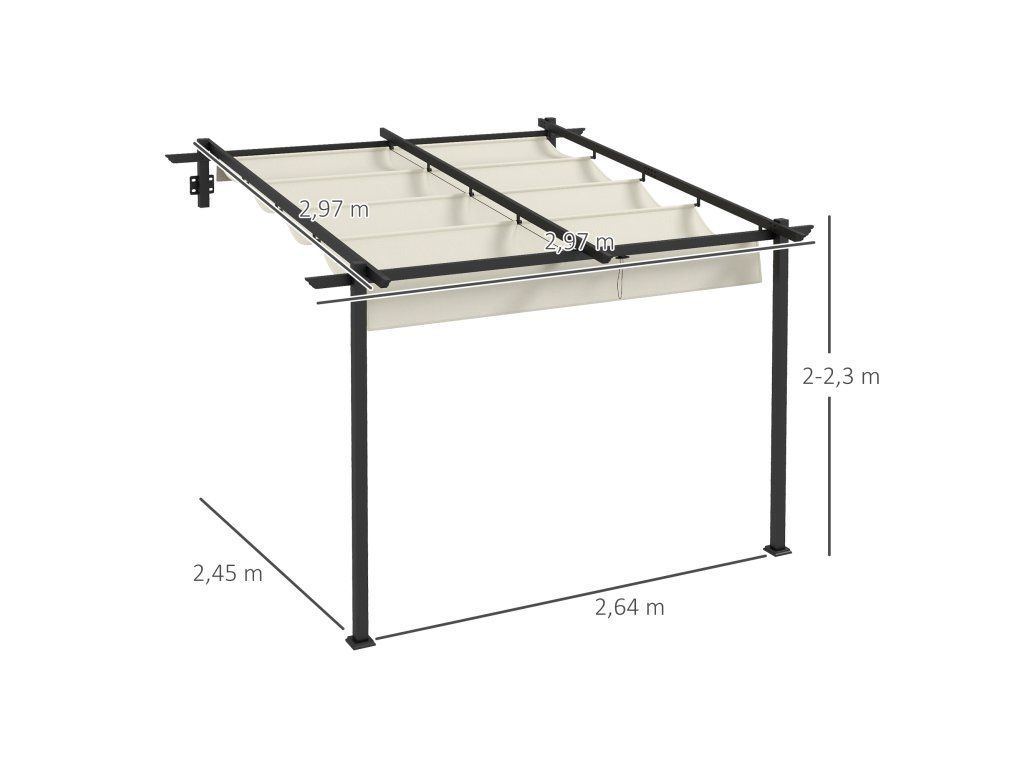 - Celkové rozměry pergoly: Rozměry: 297L x 297W x 200/230H cm, přičemž vzdálenost mezi podpěrami je 264L x 245W cm.