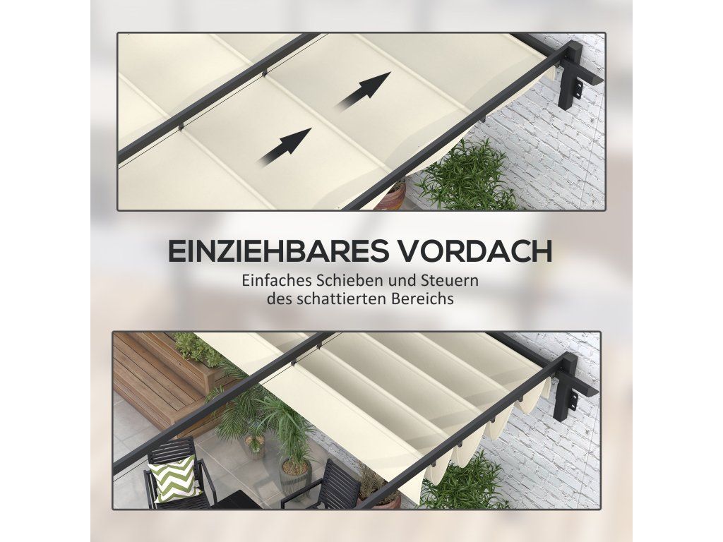 Altán [NÁZEV ZNAČKY] se zatahovací střechou vás ochrání před sluncem, zatímco budete jíst, povídat si nebo odpočívat. Integrovaný odvodňovací systém v krytu pergoly rychle odvádí dešťovou vodu. Robustní kovový rám zahradního altánu odolný proti korozi je připevněn ke zdi a vytváří příjemné venkovní prostředí.