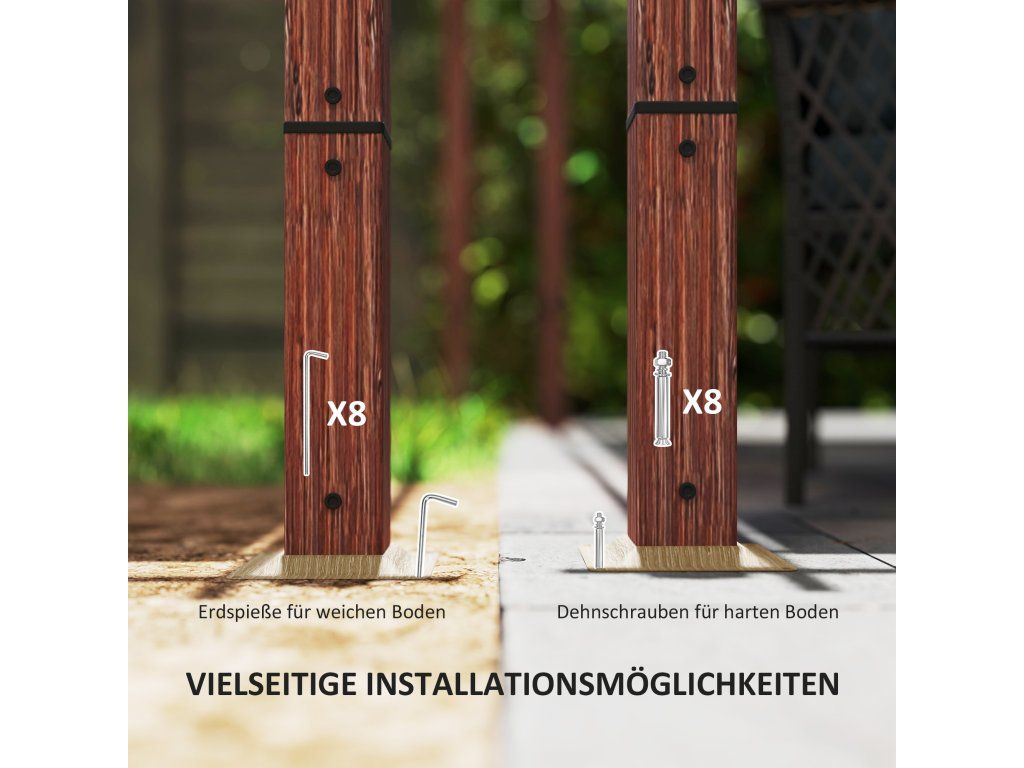 - Příslušenství v ceně: Altán je dodáván s 8 zemními kolíky a 8 kotevními šrouby, které jsou vhodné pro montáž předvrtaných patek o rozměrech 18 x 18 cm na cement, trávu nebo beton