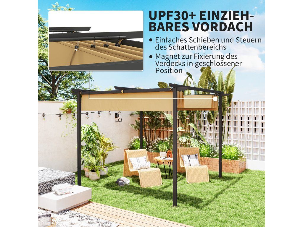 Vyzkoušejte všestrannost venkovního bydlení se zatahovacím altánem s posuvnou střechou od [NÁZEV ZNAČKY]. Tato pergola nabízí zatahovací stříšku, kterou lze nastavit v závislosti na slunečním svitu, je vybavena magnety pro pevné uzavření a odtokovými otvory, které zabraňují hromadění vody. Tkanina přístřešku odolná proti UV záření s ochranou UPF30+ slibuje dlouhotrvající venkovní radost.