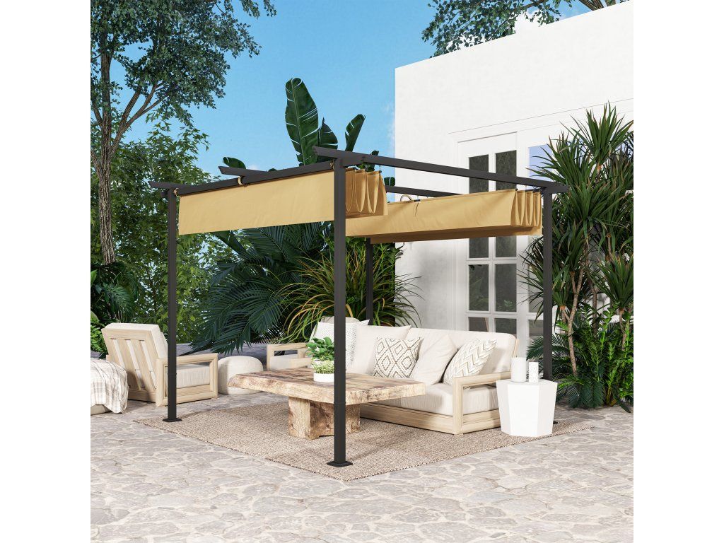 zahradní pergola 3 x 3 m s nastavitelnou střechou, kovový rám, ochrana UPF30+, sluneční stříška na verandu, terasu, béžová barva