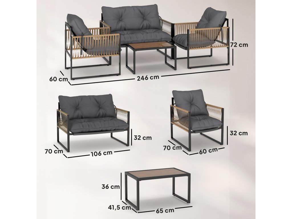 - Informace: Rozměry pohovky: 106L x 70W x 72H cm, rozměry křesla: 60L x 70W x 72H cm, rozměry stolku: 65L x 41,5W x 36H cm. Nosnost: pohovka: 220 kg, křeslo: 120 kg, stůl: 25 kg. Nutná montáž jednou osobou