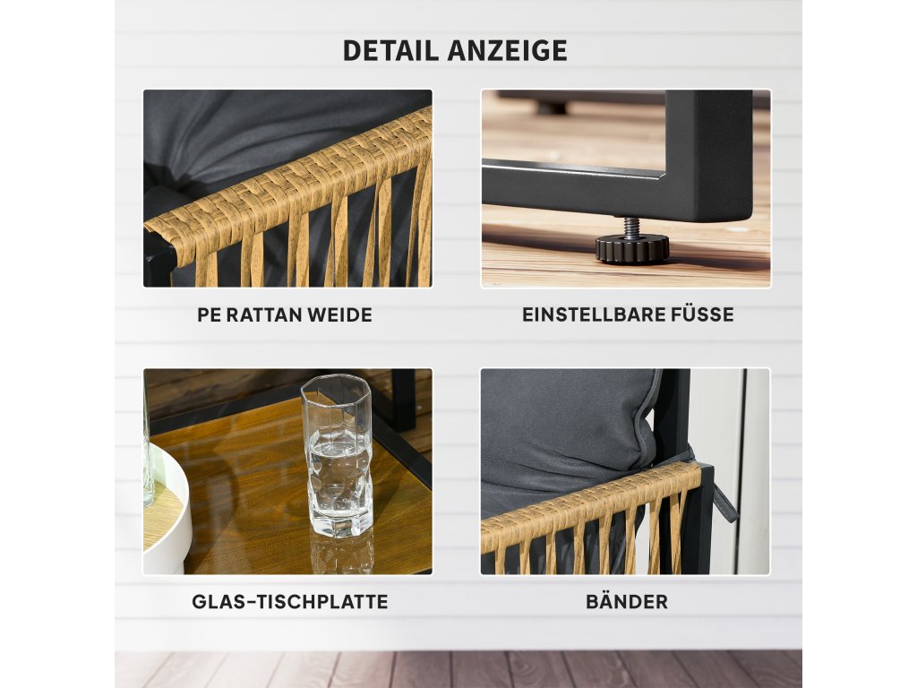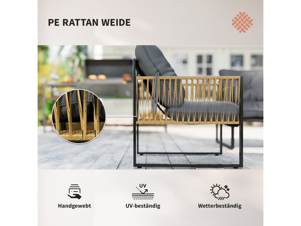 - Čistá venkovní relaxace: užijte si příjemné hodiny na verandě, na zahradě nebo v jiných venkovních prostorách s touto 4dílnou ratanovou sedací soupravou, která se skládá z pohovky, 2 křesel a konferenčního stolku. Ratanový vzhled a dekorace v podobě knoflíků dodají vašemu venkovnímu prostoru nádherný dekorativní nádech
