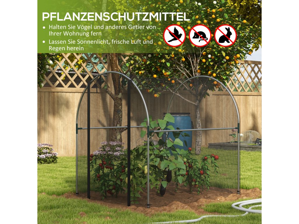 - Síť na ochranu rostlin: Tento stan chrání vaši úrodu před ptáky a jinými drobnými živočichy a chrání zeleninu, ovoce, květiny atd. před poškozením. Síť umožňuje volný průchod slunce a deště, aby vaše rostliny zdravě prospívaly