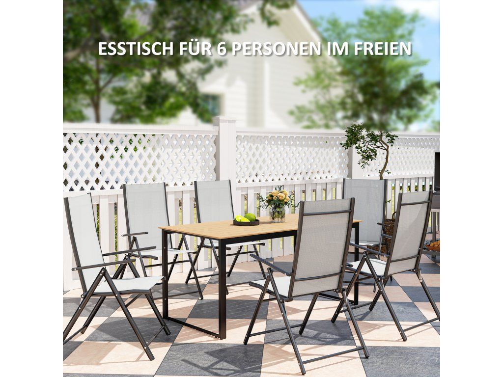 Zažijte potěšení z venkovního stolování se zahradním stolem [NÁZEV ZNAČKY] odolným proti povětrnostním vlivům, který kombinuje stylový design s praktičností. Tento malý zahradní stůl pro šest osob má dřevěný vzhled a lamelovou desku, která je robustní a snadno se čistí. Práškově lakovaný nerezavějící rám zahradního stolu slibuje dlouhotrvající radost ze zahrady.