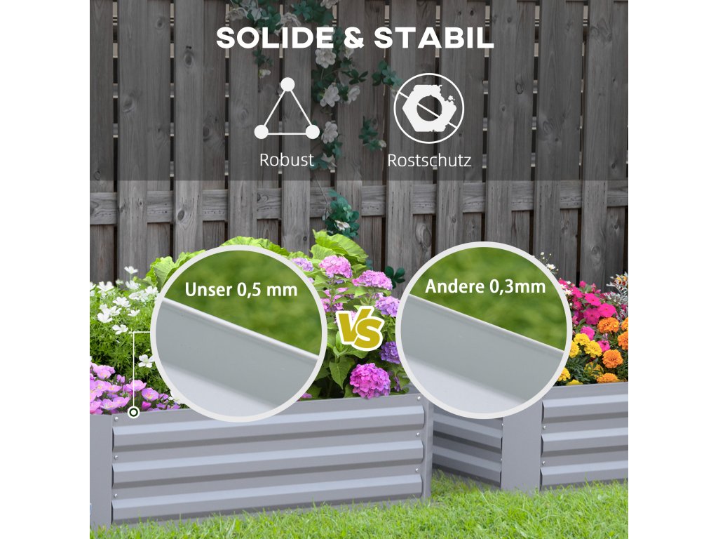 Pokud máte na terase nebo balkoně omezený prostor a chcete pěstovat květiny nebo bylinky, je pro vás tato pozinkovaná vyvýšená zahrada od společnosti Outsunny ideální volbou! Vysoké stěny a otevřená základna vám umožní pěstovat dlouhokořenné rostliny, aniž byste se museli obávat přemokření. Udržujte svou zahradu organizovanou a přirozeně krásnou s touto nádhernou sadou.