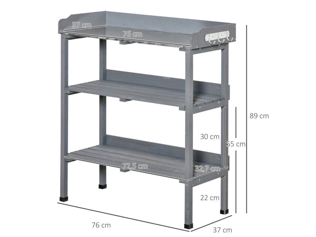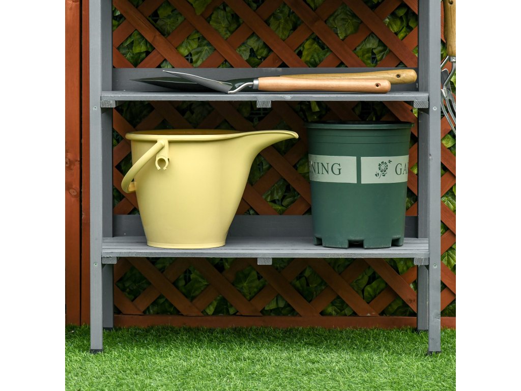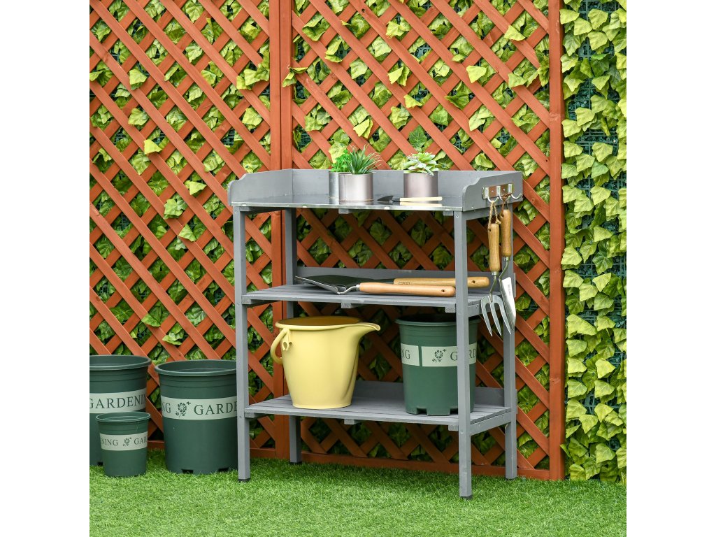 Nový stolek na rostliny od společnosti Outsunny vám usnadní práci na zahradě. Robustní dřevěný rám police na rostliny nabízí dostatek prostoru pro vaše zahradní nářadí, květináče a další příslušenství. Vše tak budete mít vždy po ruce. Zahradnické nůžky, lopatku na květiny nebo rukavice můžete snadno zavěsit na tři háčky na boku. Zahradnický stolek je pohodlně vysoký, takže bolesti zad a práce v předklonu jsou minulostí.