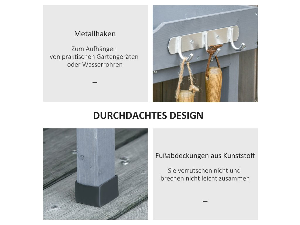 - DOST MÍSTA: Do dvou úložných prostorů můžete snadno uložit květináče, zeminu a často používané zahradní nářadí. Lopatky, zahradnické nůžky a rukavice lze uložit na tři háčky umístěné po stranách.