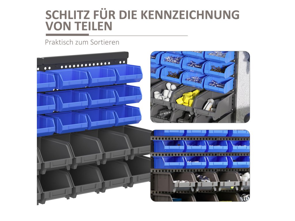 Žlabový regál DURHAND, 63 x 18 x 37,5 cm, 30 boxů ve 2 velikostech, se 2 děrovanými policemi, dostatečný prostor, pro garážové dílny, plast, modrý | Aosom